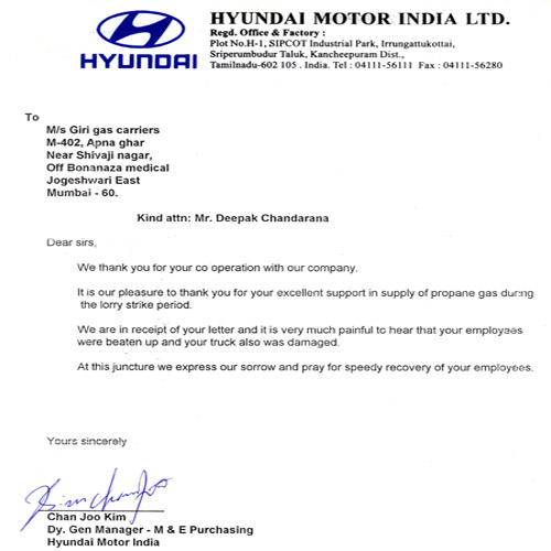 valued customer HYUNDAI MOTORS was having very low stocks of Propane at their plant near Chennai. We